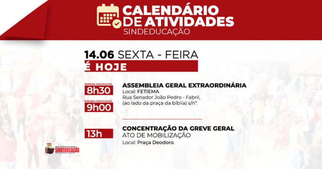 O Sindeducação convoca os educadores da Rede Pública Municipal da Capital para as atividades de luta dessa sexta-feira, 14. À tarde, a Greve Geral acontece a partir das 13 horas, na Praça Deodoro, com a participação dos trabalhadores de todas as categorias; estudantes das universidades, institutos federais, escolas estaduais e municipais; e movimentos sociais em geral. As pautas centrais giram em torno da defesa da Previdência Social e da Educação Pública, dentre outros.