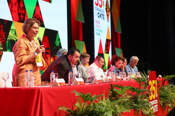 Já a coordenadora da Internacional da Educação para a América Latina, Gabriela Bonilla, fez um resgate simbólico da trajetória da CNTE. “No hino de vocês se fala em ‘paz no futuro e glória no passado’. Essa glória revela o quanto a CNTE foi e segue sendo importante. O meu país precisa da CNTE”, disse.